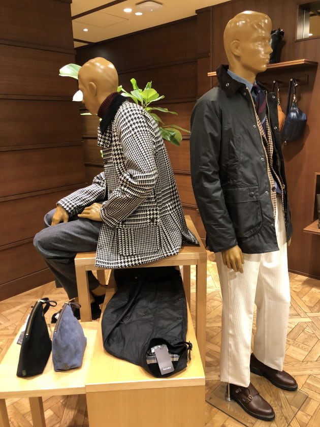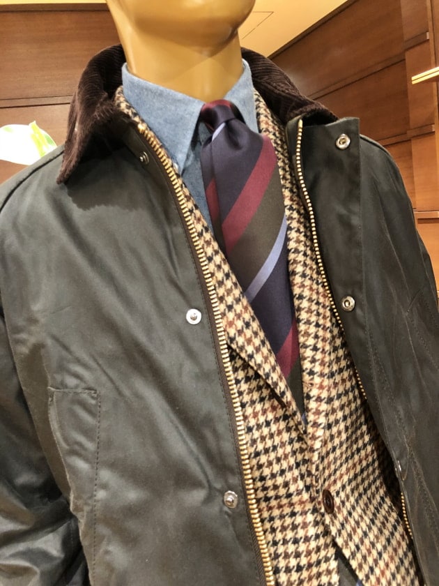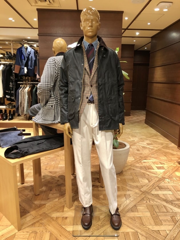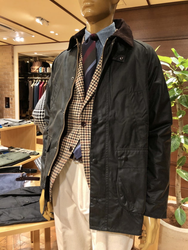 この時期の羽織り物として間違いない〈Barbour (バブアー)〉の定番BEDALEジャケットを、カントリーな雰囲気のジャケットに羽織ったコーディネート。