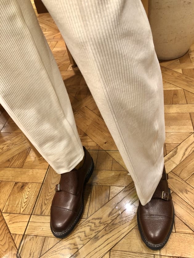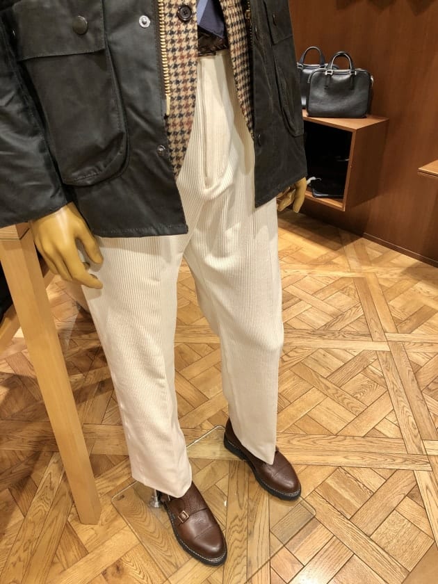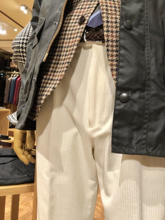 上半身の秋冬らしい色合いが映えるようにパンツはホワイトを。素材をコーデュロイにする事で今シーズンらしさと季節感を持ち合わせた着こなしがお楽しみ頂けます。