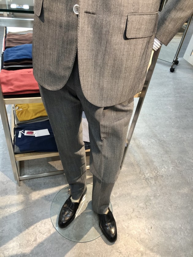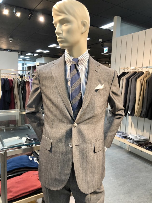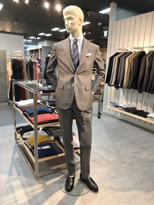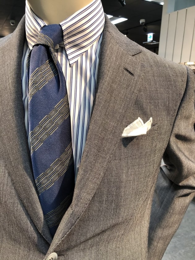 モヘヤ混の春夏らしい涼し気な淡いグレースーツに、同じく淡い色合いのブルーのシャツタイでコントラストを付けずにまとめております。