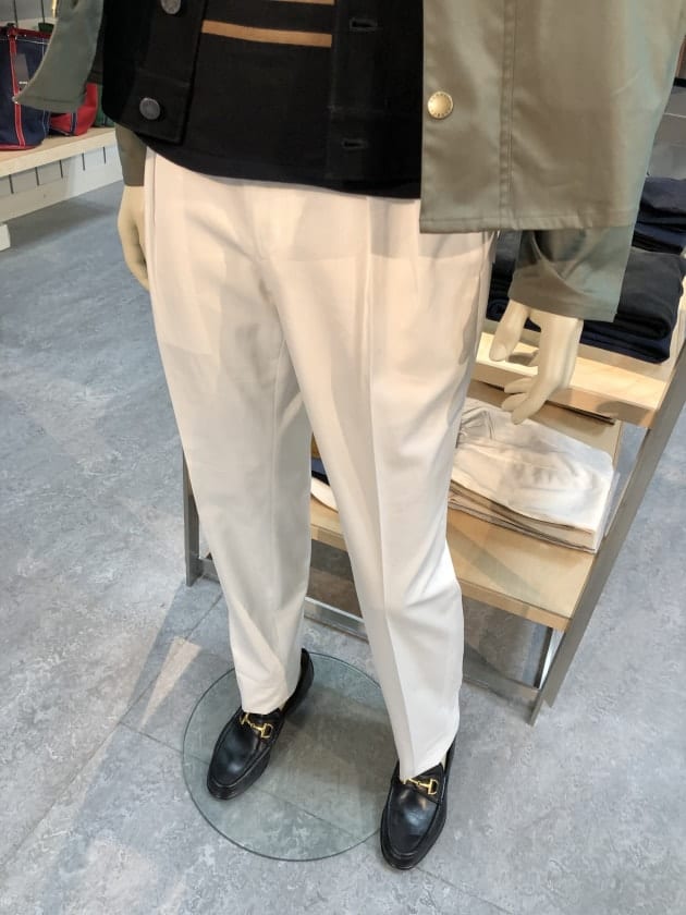 足元は自身も愛用しているカーフのバタフライローファーで。