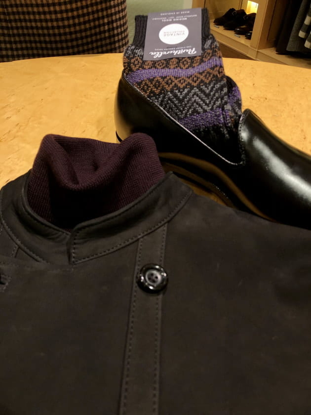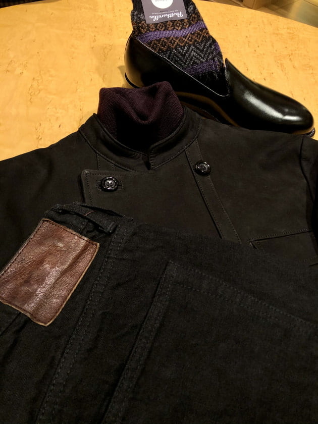 メリハリをつけないブラックスタイルに、タートルネックのパープルを差し、ソックスにボリュームとインパクトを。