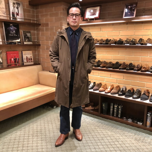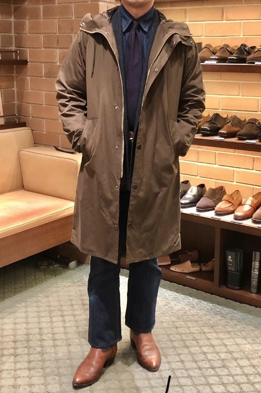 オイルドコットンのような風合いのピーチスキン素材を採用、程よくハリやコシのある素材感は中に着るものを変えれば長いシーズン着用出来る優れ物。