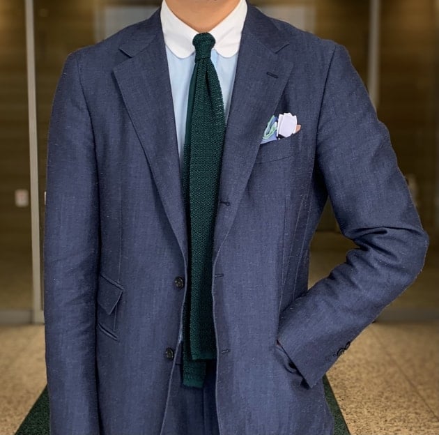 初めて〈ASCOT〉のニットタイを購入した時に選んだ色はネイビー。使っていくうちに柔らかくなりタブカラーに収まりやすくなったのではないかと個人的に思っています。