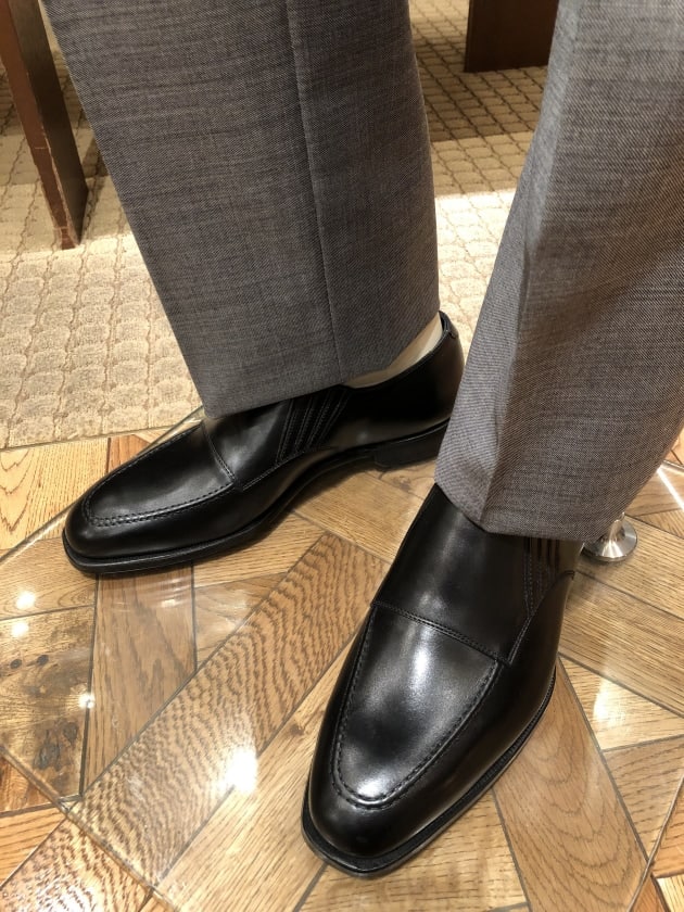 ビスポーク感あるデザインのサイドエラスティックシューズが良く似合う。