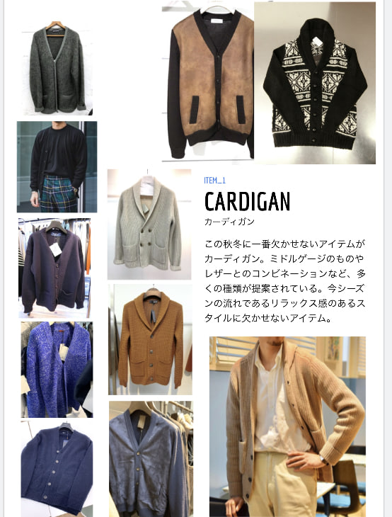 どちらの着こなしのイメージにも出てきた「カーディガン」は次の秋冬の注目アイテム!となっておりますが、これについては