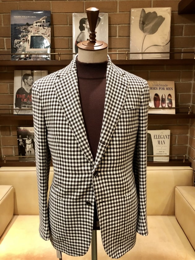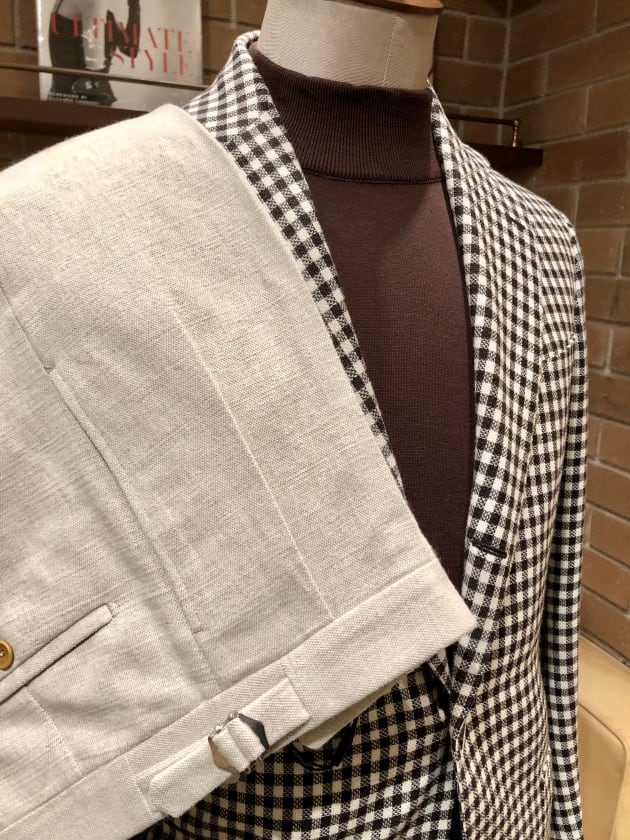 〈De Petrillo〉のブラウン+ホワイトのチェックジャケットに、〈JOHN SMEDLEY〉のショートスリーブのコットンモックネックニットを。
