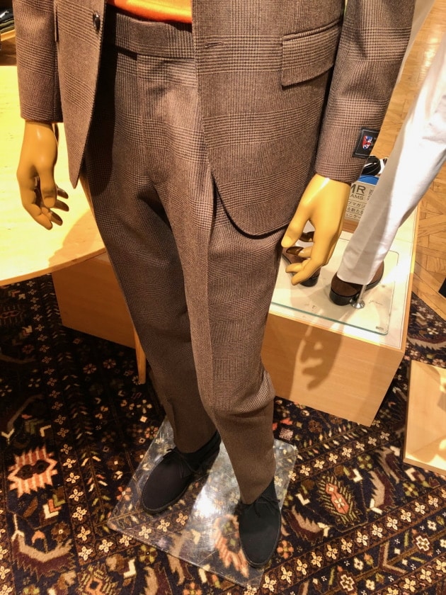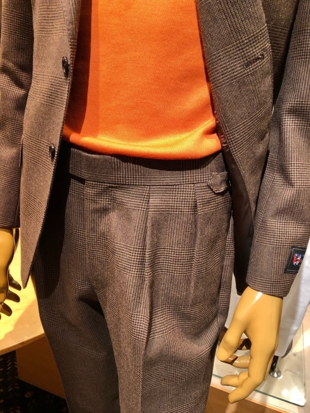 サイドアジャスター仕様のスーツなので、ニットをタックインしたカジュアルダウンの着こなしもお楽しみ頂ける優れ物。