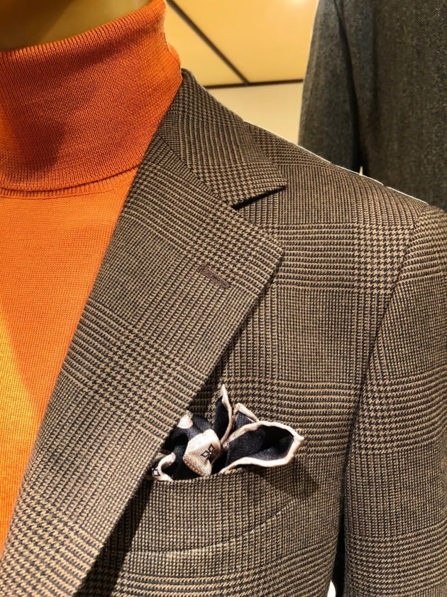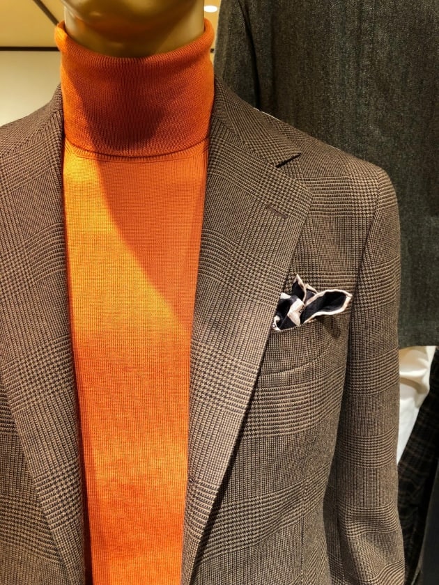 一見難しそうな印象のオレンジですが、ブラウンスーツに映えながらもうまく馴染んでおります。
