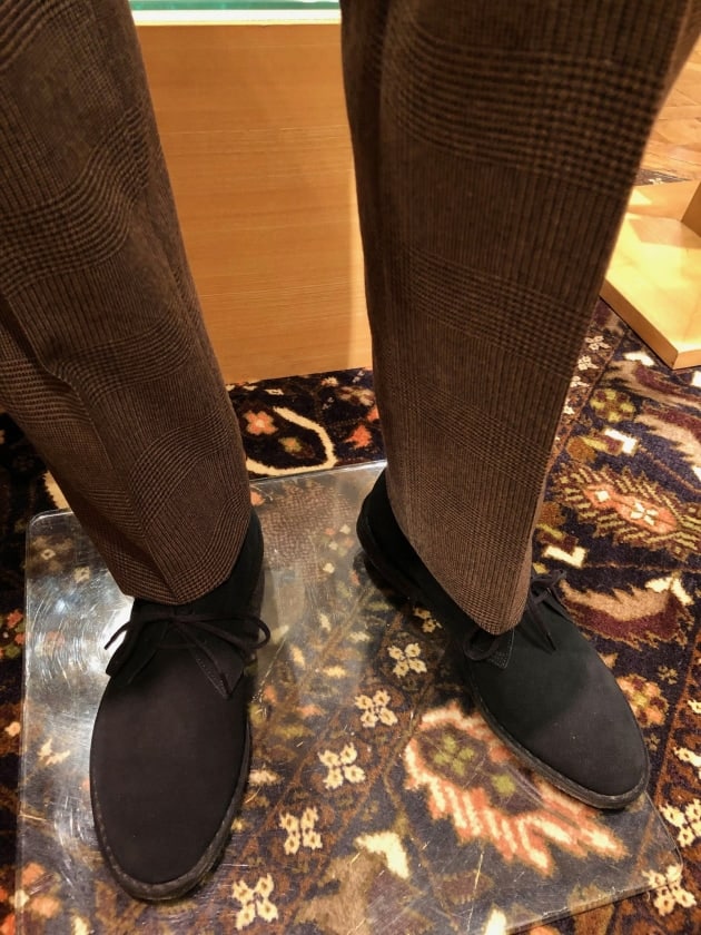 キレイな色を着こなしに取り入れるのが特徴のフレンチな雰囲気にタートルネックニットのボリューム感とを合わせて、ブラックスエード素材のチャッカブーツを履かせてみました。