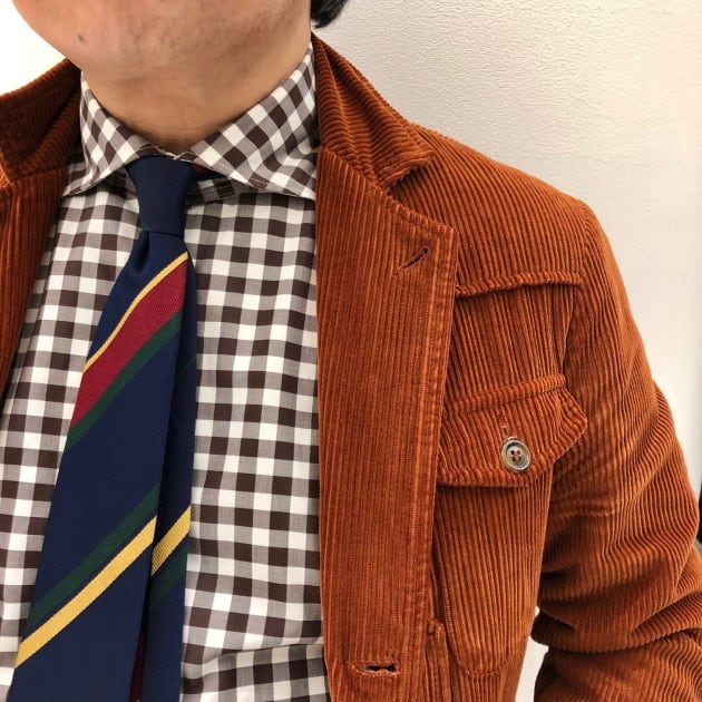 ハンティング型ジャケットを中心に高橋の十八番であるチェックシャツにストライプタイを合わせたVゾーンで古臭く見えないようにモダンに印象に仕上げております。