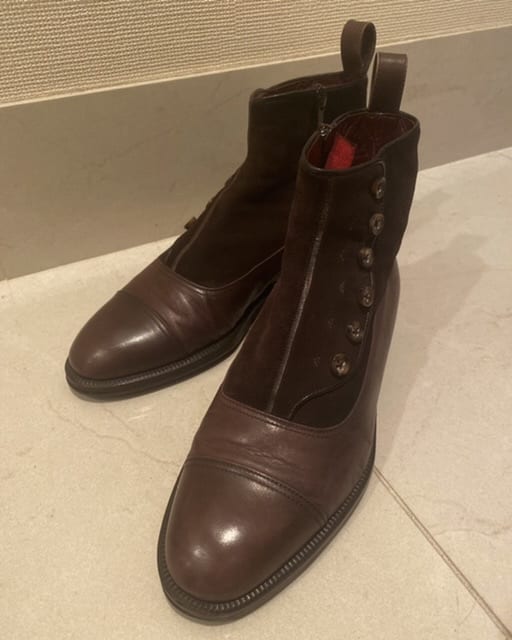 レースアップどころか脱ぎ履きを従者にやってもらわないとままならない8年位前のエンツォボナフェのオーダー会で作ったボタンブーツ。それでも当時オーダー価格は14万円位。今じゃ既製品でもその位の価格ですから作っておいて良かったですね。今までボタンブーツを履いていたのを見たのは菊池さんと伊藤さんだけでした。この男爵みたいなスーパードレスボタンナップシューズをカッコ良く履けるスーツスタイリングを模索して早10年。