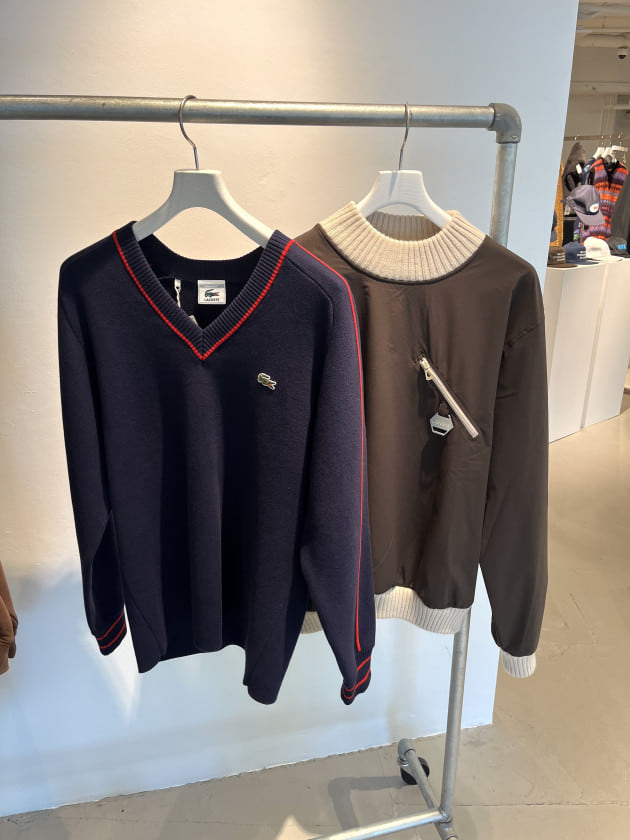 入り口正面のテーブルには、色鮮やかなデザインニットからシンプル且つ小慣れ感のあるポロシャツやナイロンパンツが並んでおります。