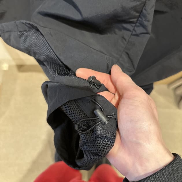 黒色のシェルパンツから赤色のパンツがチラ見え。