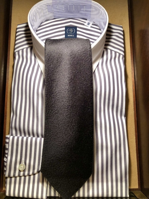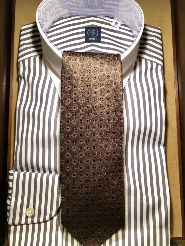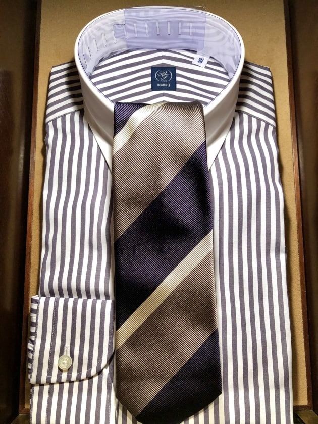 【BEAMS F】タブカラーシャツ。ロンドンストライプ。クレリック。とてんこ盛りのディテールですがスッキリしております。