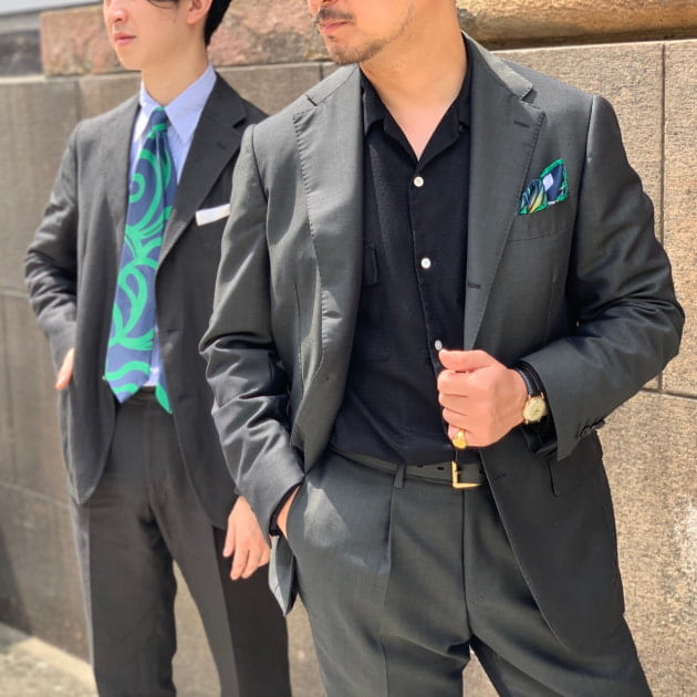 『グリーンのスーツ被りましたねー』と、当店VMD担当と一緒に撮影。