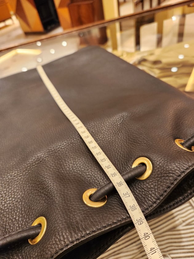 高さは約38cm。スマホ、サイフ、鍵、文庫本、イヤホン、500mlの水筒は入ります。