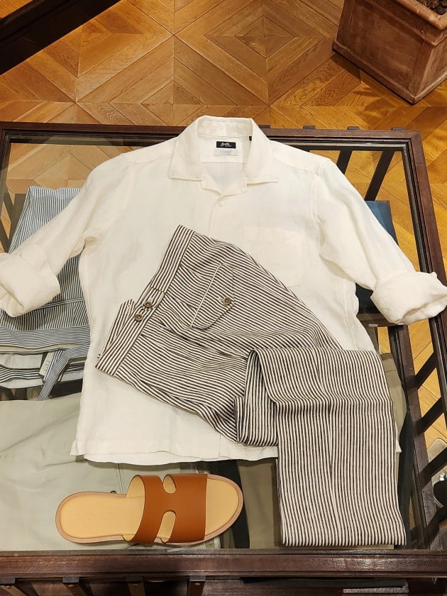 リネンシャツにワイドパンツ。イメージは海辺でコーヒーカップ片手に優雅に歩く様。海風でリネンシャツがなびいています。っていうシチュエーションがいいと思います。