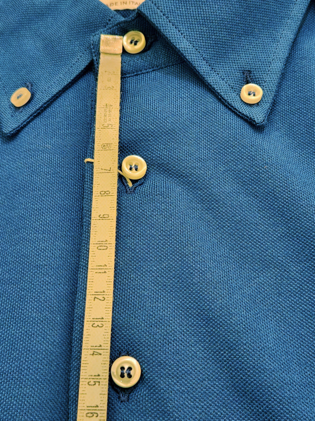 ボタンの距離が少しだけ異なるのはわかりますか。約1.5cmの差があります。第一ボタンを開けてもイヤらしくない広がり。こだわってます。