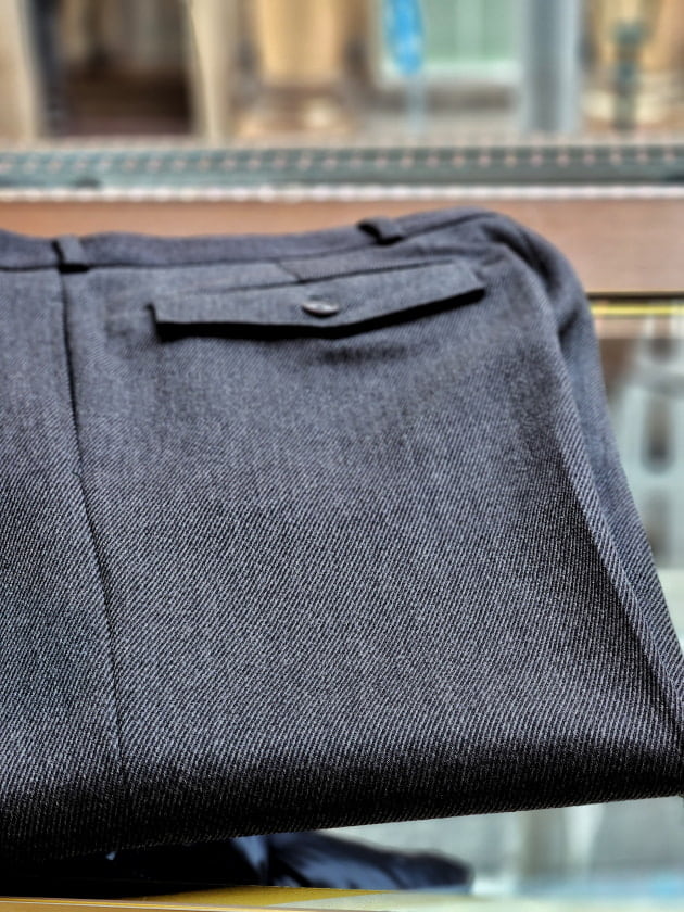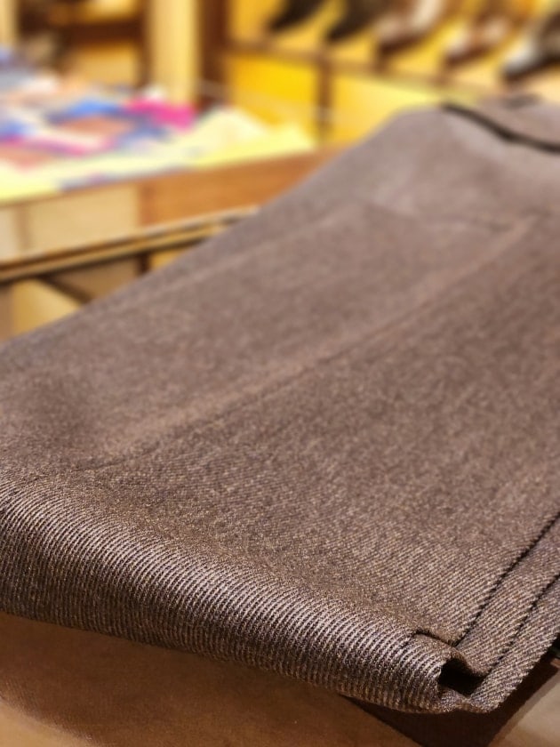 生地は起毛たっていて、光沢も見えます。上品なパンツ。
