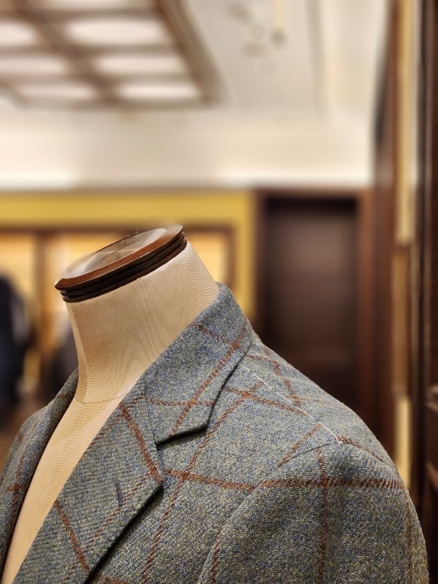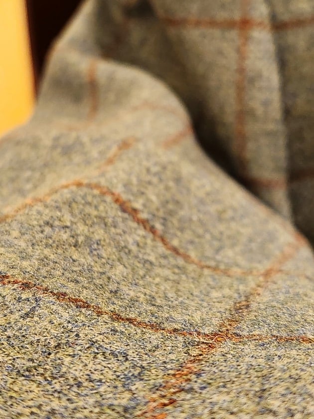グリーンをベースのブラウンのウインドウペーンのツイードジャケット。