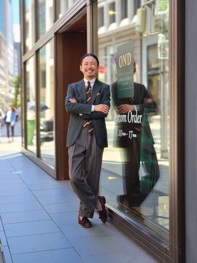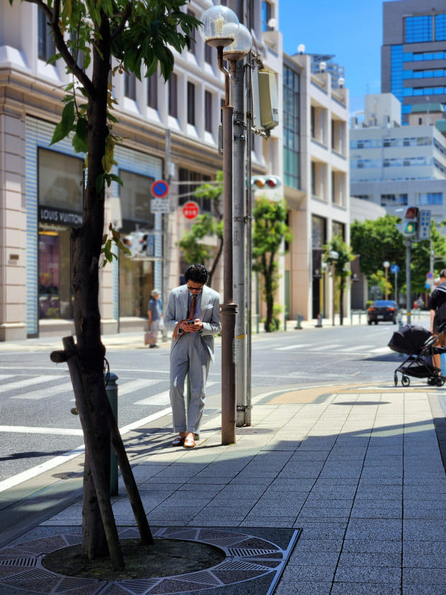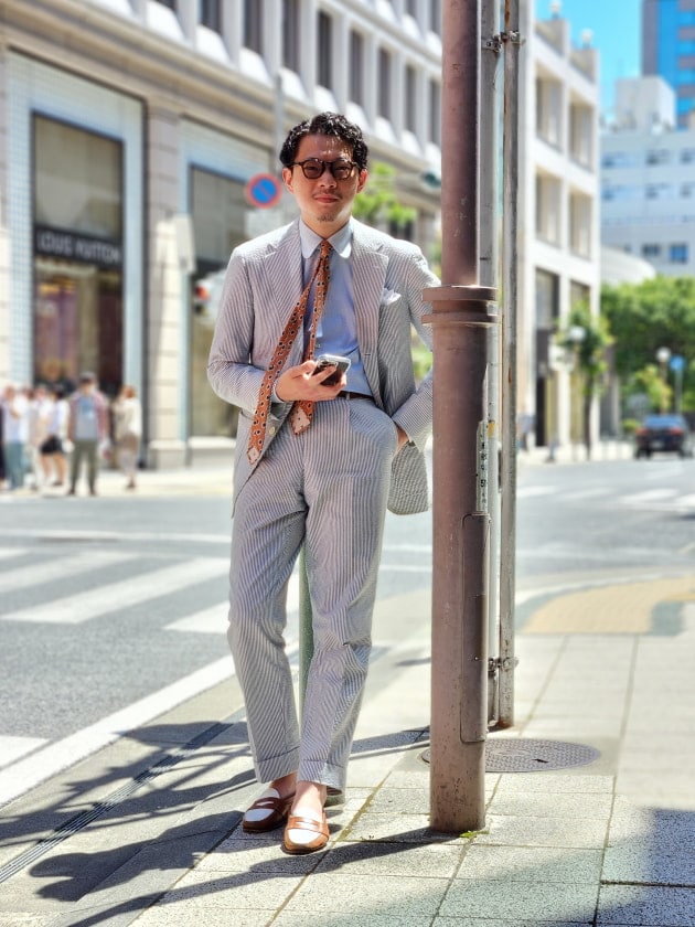 カメラに気付いた彼はポケットに手をいれて、さらに澄ましました。夏にシアサッカー、夏にしか着られないシアサッカー。夏だからこそ様になるシアサッカー。