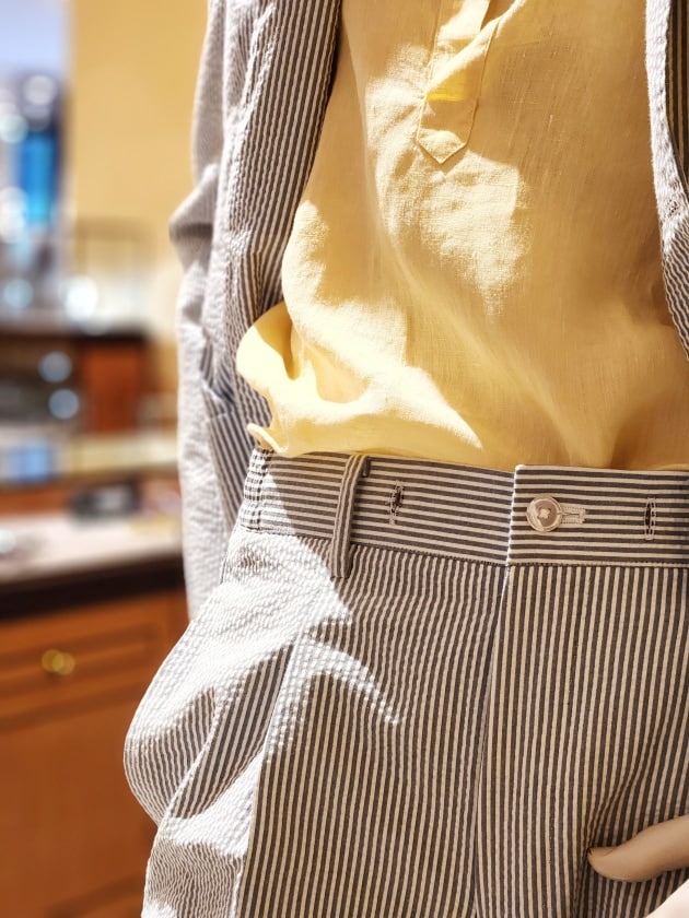 ここにもいました澄まし顔。シアサッカーを着用したら澄ましていい説、あります。彼のインナーはプルオーバーシャツでした。