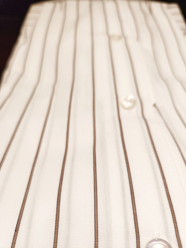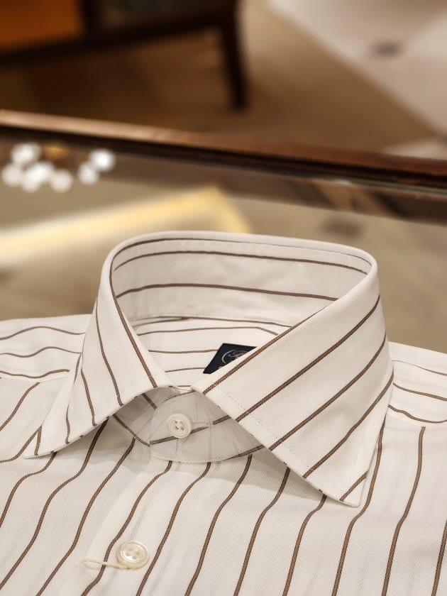 スーツに合わせるとクリーンな印象になります。白シャツではあどけない、だけど何か欲しい。そうなったらこのシャツがおすすめ。