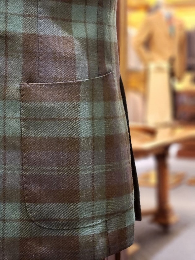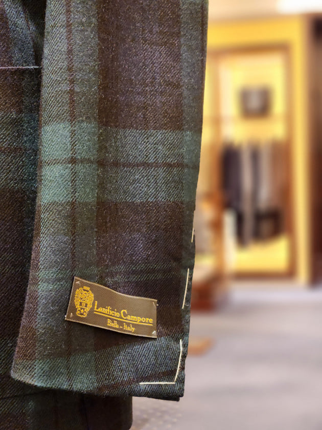 生地は、Lanificio CAMPORE。カンポーレで名が通っています。1830年にイタリアのビエラで創業。ウール100%。ウールの糸が、細いことで若干の光沢が生まれています。