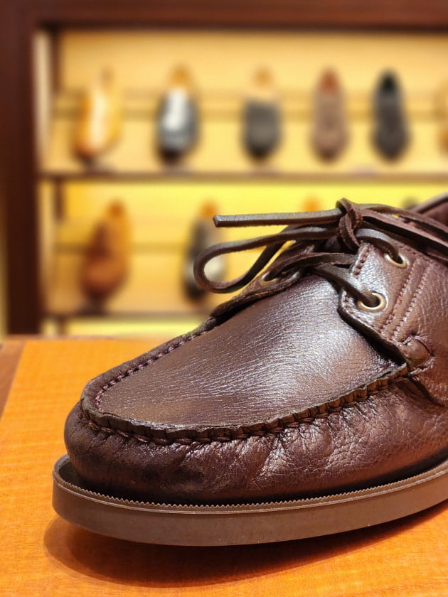ファーストクラスなディアスキンで縫製されたデッキシューズ。