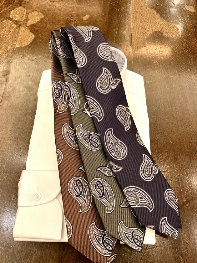 こちらも【Holliday & Brown】双子ペイズリー柄タイ。ペイズリーを小紋に変換しておりますので、ビジネスシーンでも取り入れていただきやすいですよ。