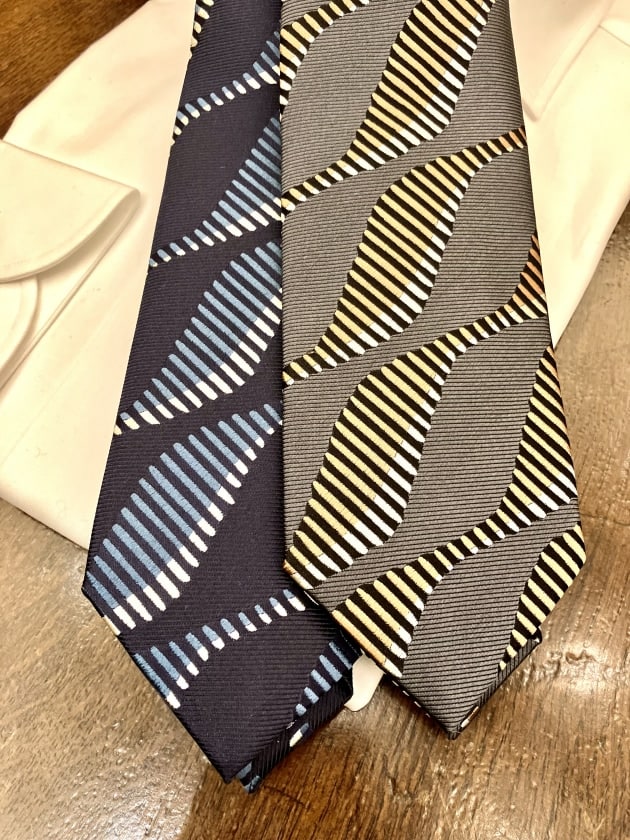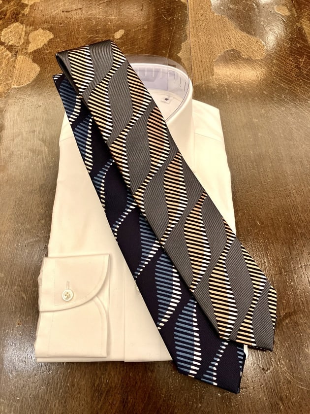 こちらは【Holliday & Brown】のジオメトリックタイ。モチーフはウェイブです。私はスイミーを思い出しました。横ピケ織に刺繍で波模様が施された表情のある仕上がりです。