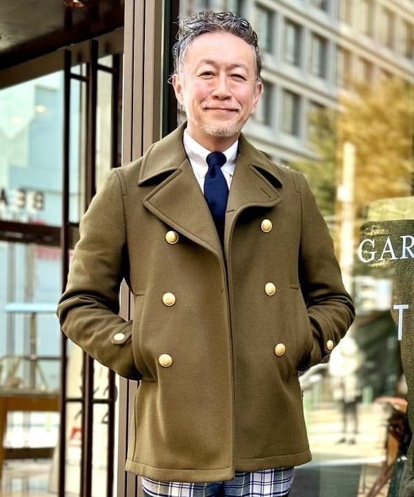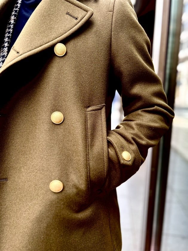【TAGLIATORE】の別荘『MONACO』ピーコートです。既存のパターンが非常にタイトなバランスだったため、ジャケットの上に羽織れるフィッティングに肩幅、身幅を修正しておりますよ。