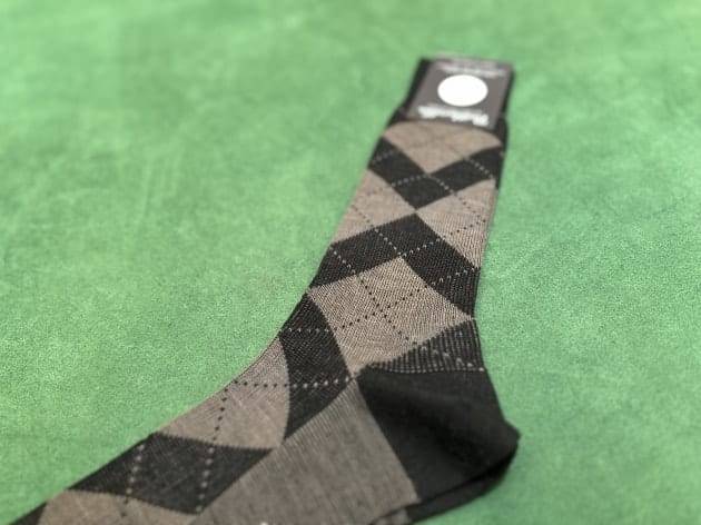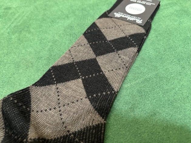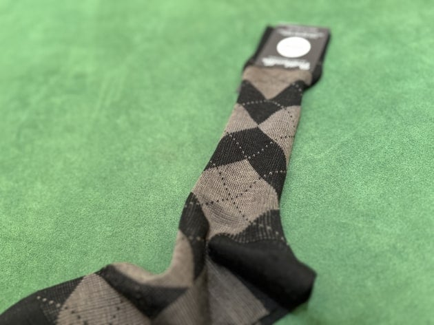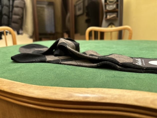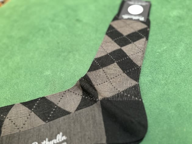 ブラックとライトブラウンの2色構成。このライトブラウンの色が絶妙なんです。絶妙!茶の色めが強くないのであらゆる靴、パンツの色と馴染むんです!そしてなんといっても柄です。