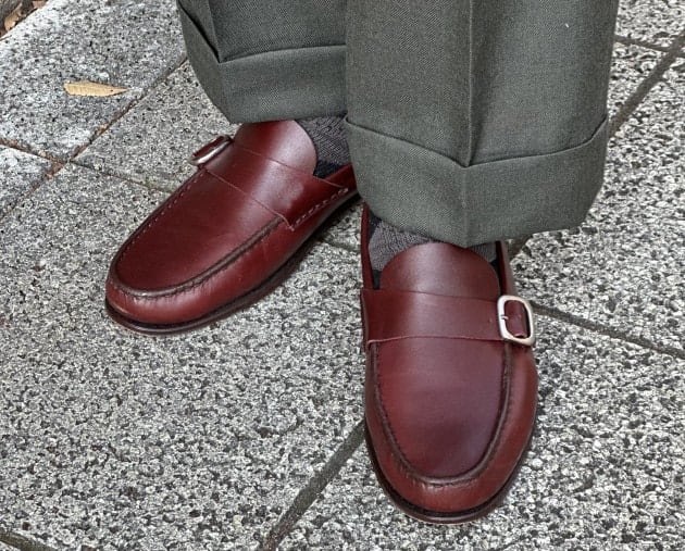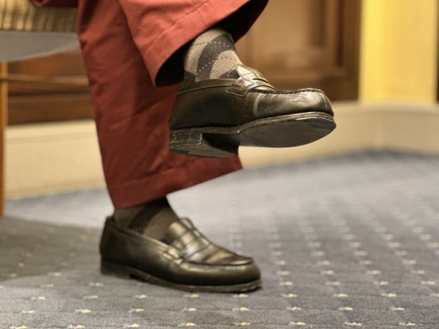 スタッフ清水は赤のパンツに黒靴!裾幅の太いパンツにさりげなく見えるアーガイル。粋ですねー