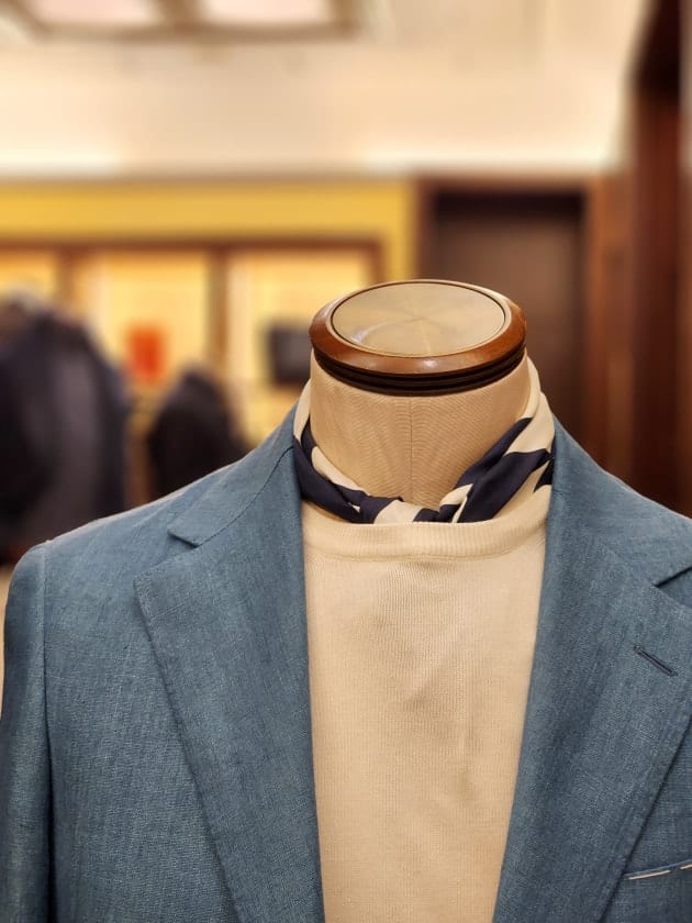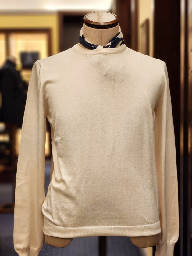 上述したようにカジュアル使いならば、クルーネックにネッカチーフがnerosawaのおすすめ。