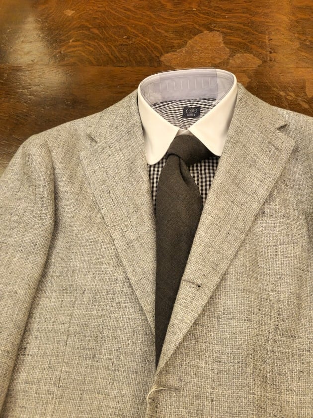 ボディはギンガムチェックでクレリック。それにセッテピエゲのソリッドタイで引き締める。
