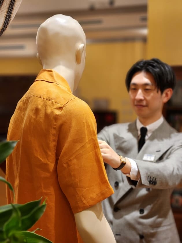 マネキンに睨まれながらも着せかえをしているのはスタッフ宮原。
