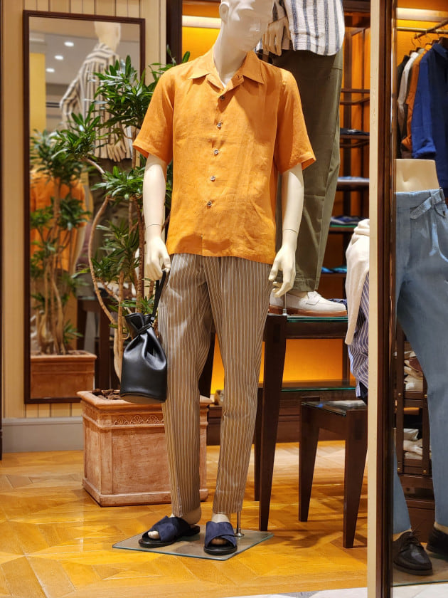 魂を宿した結果、こうなりました。オープンカラーシャツにストライプパンツ。オレンジシャツから上手く色を拾ったストライプパンツ。