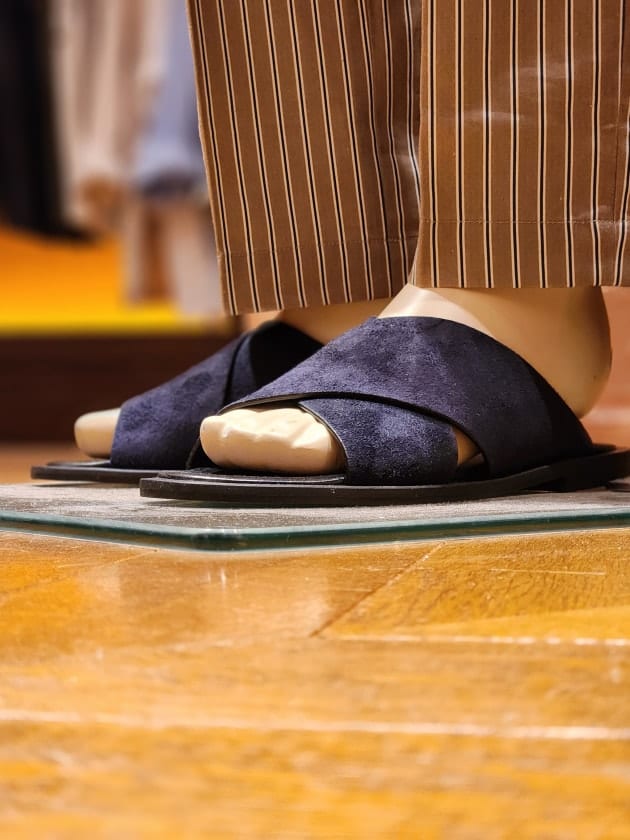 夏といえばレザーサンダル。大人なコーディネートへグッと近付かせます。