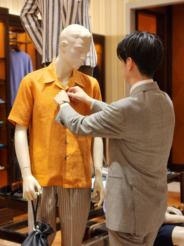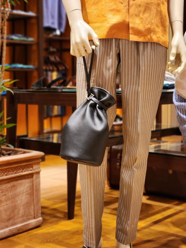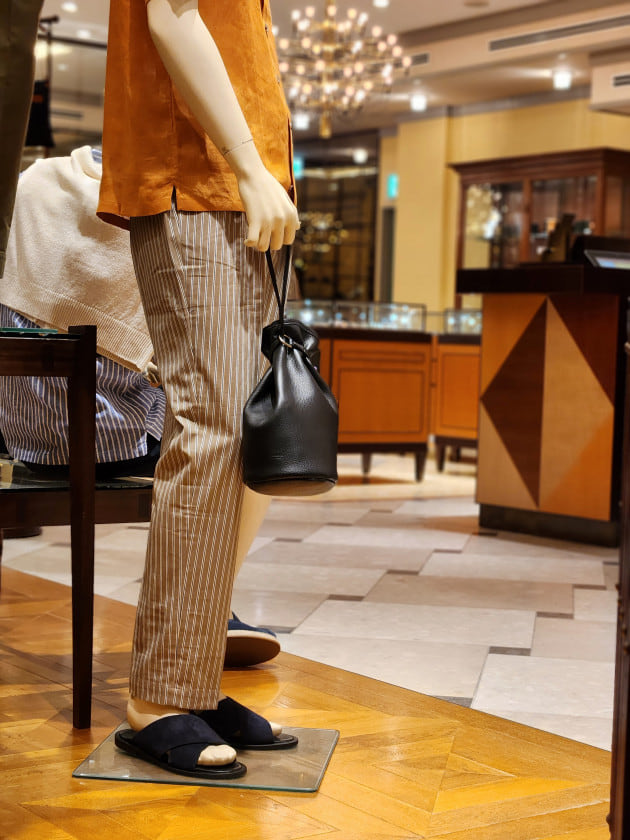 洒落てますね。VMD担当のスタッフ宮原、魂を宿します。マネキンの手に鞄を持たせるほどの魂。