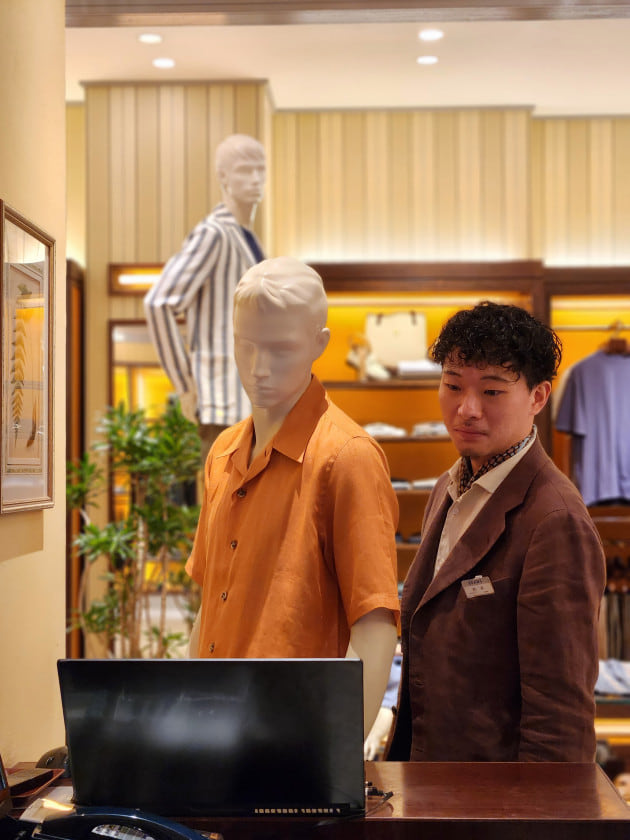 パソコン画面が気になったのでしょうか。岩本も秋冬商品に釘付け。彼、24秋冬商材にとても詳しいんです。なぜなら商品説明会に参加しているから。