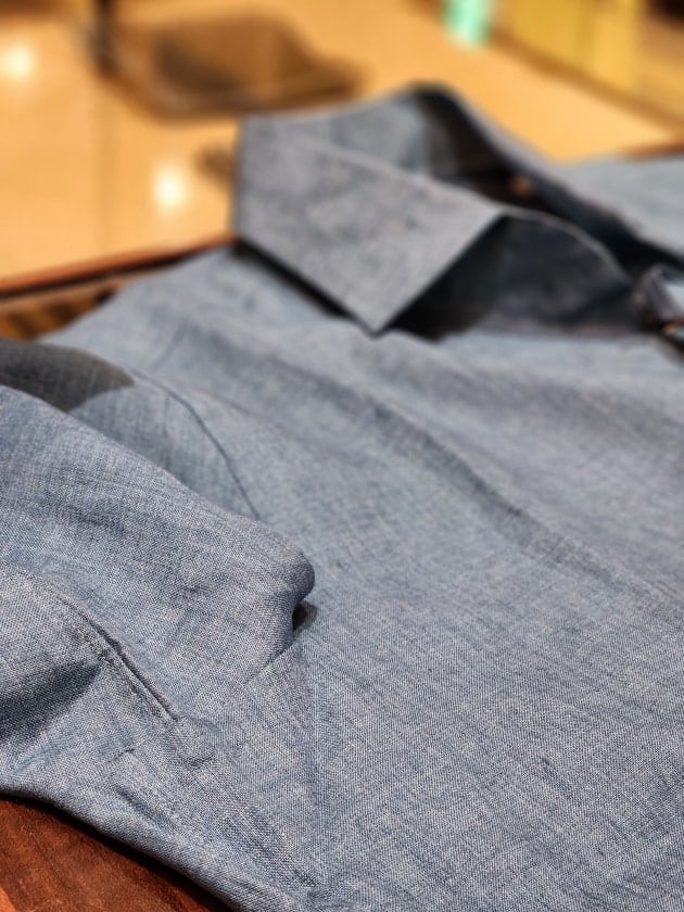 高級シャツによくある輪付けと呼ばれる手法。ボディに袖を後から取り付けることで立体感と可動域が広がります。上の画像のようにボディと腕部分のミシンが途中で別れています。それがその証。