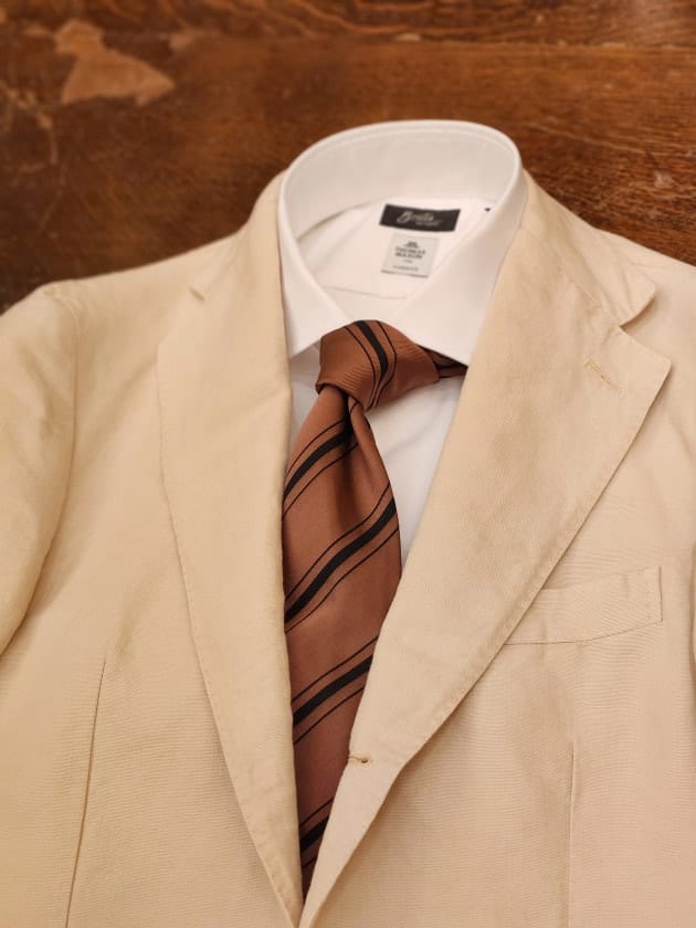エクリュカラーにライラックカラーのネクタイをバチッと。たまに、こういう格好したくなる時ありませんか?nerosawaはこれに憧れています。