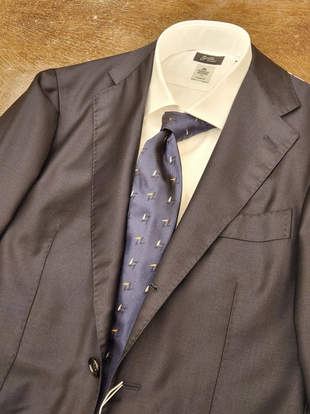 ネイビースーツに合わせてシャツは白でパキッと。たまに、こういう格好したくなる時ありませんか?nerosawaはあります。