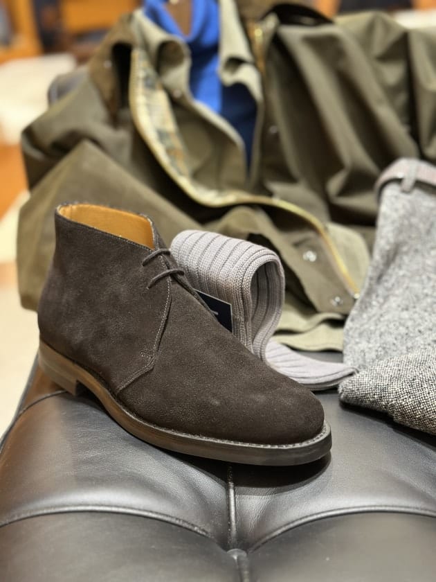 茶靴だとカントリー感が強まるので、ブラックスウェードで洗練された雰囲気に!