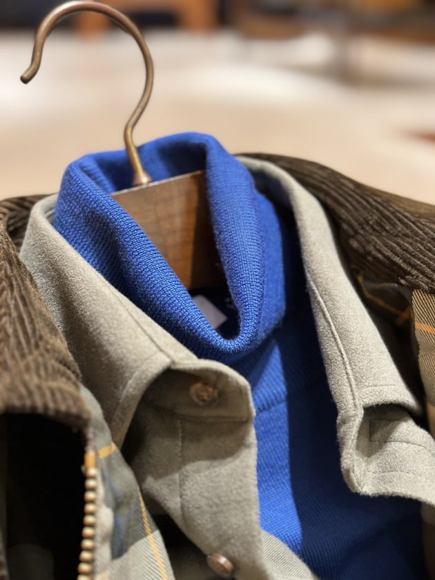 モールスキンのオーバーシャツ。ジャケットの丈との差を活かしたレイヤードスタイルを是非試して頂きたいです!