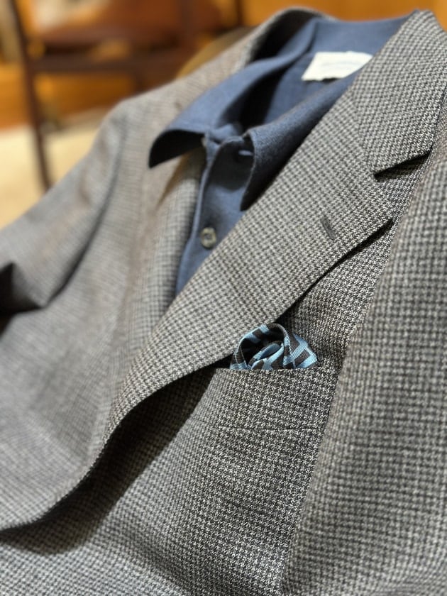 ニュアンスで馴染ませて、チーフでパッと映えるターコイズを!ジオメタリック柄というのもまたブリティッシュな雰囲気。