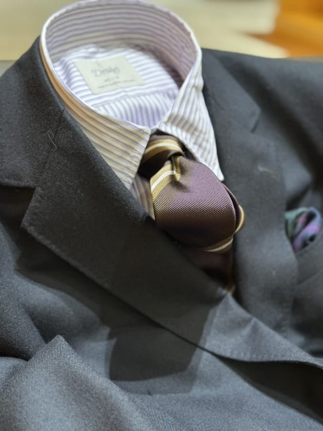 レジメンタル、クラブ要素を抑えたドレッシーなストライプネクタイ。