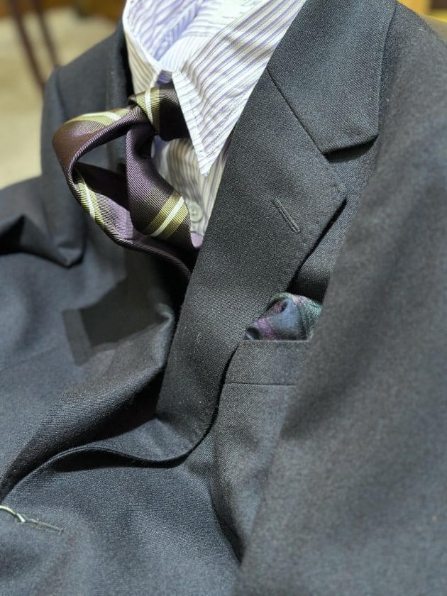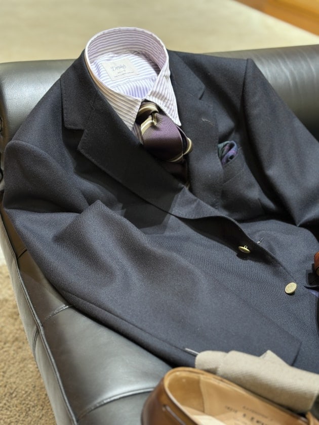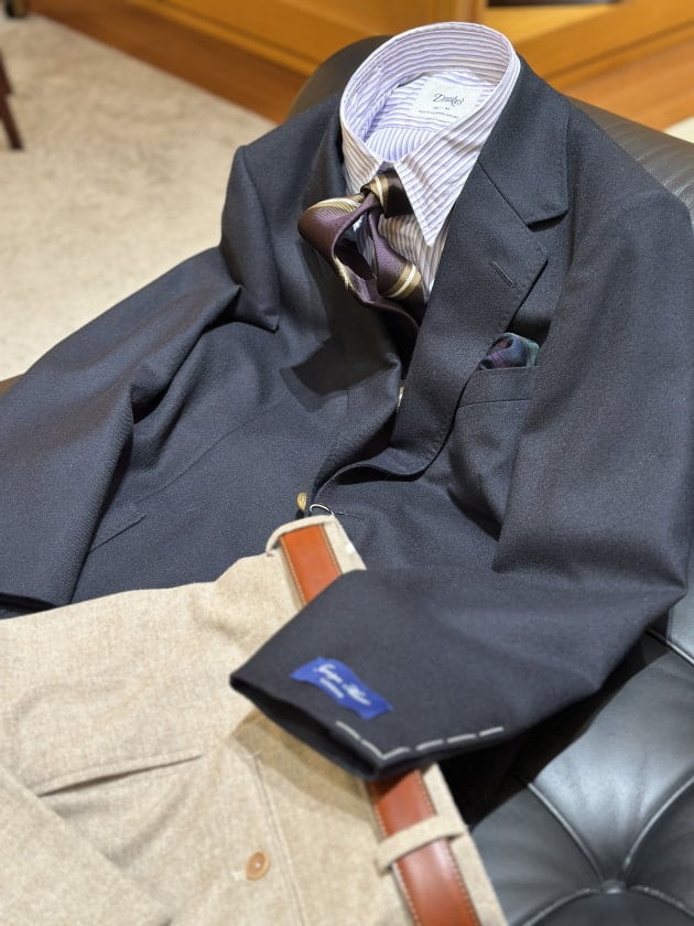 英国テーラーで修行を経た平野氏が手掛ける、アメリカンブレザー。構築的と適度なイングリッシュドレープ、フックベントという寸胴なブレザーとは打って変わったエレガントなブレザー。