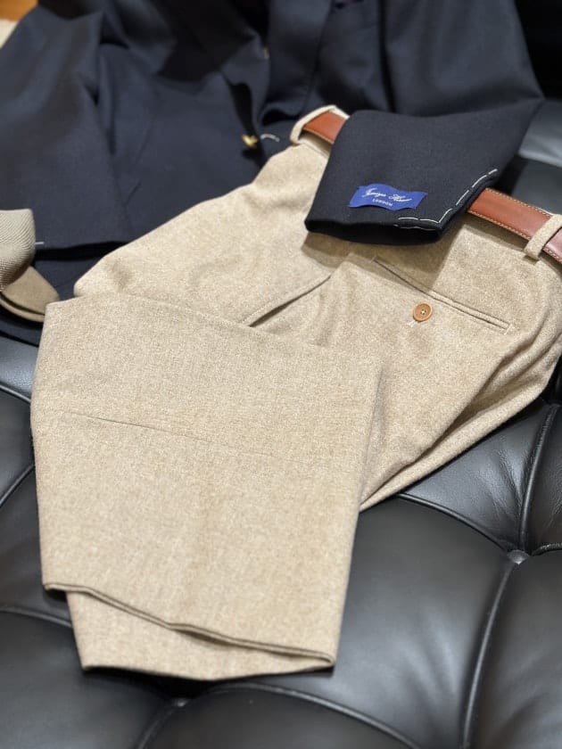 グレースラックスでもいいですが、アメリカンムードもあるブレザーなのでベージュのウールスラックスで!